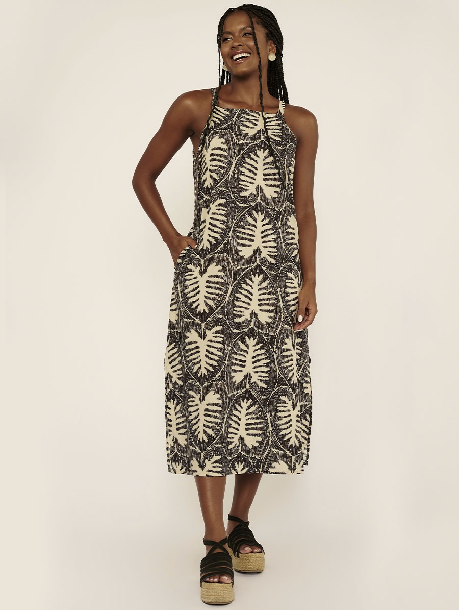 Transforme seu look com o Vestido Midi Foliage, confeccionado em tecido Milos de toque suave e secagem rápida, com uma estampa exclusiva que garante um visual moderno e elegante. O decote quadrado e o fechamento traseiro com botão proporcionam um ajuste impecável e um acabamento sofisticado. Este vestido conta com alças fixas em tecido que adicionam conforto e praticidade. Seus bolsos e fendas laterais oferecem funcionalidade e um toque casual-chic, ideal para várias ocasiões. Para um toque final de classe, o detalhe em plaquinha de metal personalizada completa o design com um detalhe único.